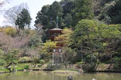 浄瑠璃寺は京都府木津川市加茂町西札場にある真言律宗の寺院で、嘉承2年(1107)の建立です。山号を小田原山と称し、本尊は阿弥陀如来と薬師如来、開基(創立者)は義明上人です。寺名は薬師如来の居所たる東方浄土『東方浄瑠璃世界』に由来しています。本堂に9体の阿弥陀如来像を安置することから九体寺(くたいじ)の通称があり、古くは西小田原寺とも呼ばれていました。緑深い境内には、池を中心とした浄土式庭園と、平安末期の本堂および三重塔が残り、平安朝寺院の雰囲気を今に伝えています。本堂は当時京都を中心に多数建立された九体阿弥陀堂の唯一の遺構として貴重です。堀辰雄の『浄瑠璃寺の春』にも当寺が登場しています。中世から近世にかけて浄瑠璃寺は興福寺一乗院の末寺でしたが、明治初期、廃仏毀釈の混乱期に真言律宗に転じ、奈良・西大寺の末寺となっています。(ウイキペディア参照)